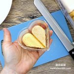 依照杯子的形状,把手指饼切半。 (温馨提示:手指饼sponge fingers 可以在烘培专卖店找到。)