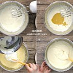 5 芝士糊:把马士卡邦尼芝士(mascarpone cheese)和细砂糖混合, 打至顺滑。加入蛋黄酱,搅拌至混合。加入已打发的鲜奶油, 翻拌均匀。(温馨提示:做提拉米苏Tiramisu用mascarpone cheese 味道比较好。Mascarpone cheese 可以在烘培专卖店找到。)