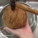 用锤子或是厚的刀背沿着椰子的赤道用力敲击,边敲边转动椰子。把椰水过滤,盛装起来。