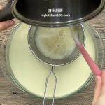 3. 把溶化的鱼胶粉过滤加入无糖豆浆,拌至完全混合。