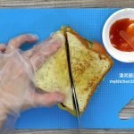 5 再加上另1片面包后,用牙签把三文治串在一起。
