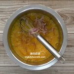 4. 把少许食油加热,倒入1份的洋葱丝蛋液。