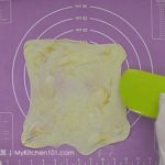 取出一个面团,涂上少许油,用手向四周压扁撑开,用擀面棍把面团擀成薄薄一片,均匀的涂上黄油面糊。