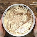 把剩余的蛋白霜分2次加入原味面糊,用人工搅拌器轻轻混合。再用刮刀轻轻翻拌至完全混合。把搅拌碗敲击桌面数次以震破大气泡。 (温馨提示:把蛋白霜拌入面糊时,动作要轻而快。橡皮刮刀从碗底往上翻转,翻拌至均匀,不可画圈搅拌,避免蛋白霜消泡。)