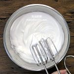 3 以低速把蛋白打至起粗泡。加入塔塔粉,继续打至细泡。慢慢把砂糖加入,继续打至干性发泡 (搅拌器拉起蛋白霜会形成直立状),不要打过头。 (温馨提示:蛋白和打蛋白的器具里不能有任何油份和水份, 包括蛋黄。建议用洗碗剂把蛋的外壳和器具清洗干净,然后用干净的布抹干。用一个干净的小碗来把蛋黄和蛋白分开,如果蛋黄破裂了,那个蛋白就不要用了。)