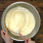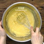 8 再用刮刀轻轻翻拌至完全混合。把搅拌碗敲击桌面数次以震破大气泡。 (温馨提示:把蛋白霜拌入面糊时,动作要轻而快。橡皮刮刀从碗底往上翻转,翻拌至均匀,不可画圈搅拌,避免蛋白霜消泡。)