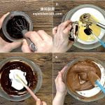 6 把热水加入可可粉拌匀。取出90克的原味面糊,加入可可糊拌匀。加入55克的蛋白霜,轻轻翻拌至完全混合。