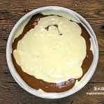 - 把热水加入可可粉拌匀。取出90克的原味面糊,加入可可糊拌匀。加入55克的蛋白霜,轻轻翻拌至完全混合。