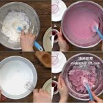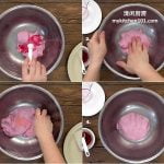 2. 把热水(70°C)加入100克糯米粉搅拌,然后加入100克甜菜根汁拌匀。把糖粉和另100克糯米粉混合后加入拌成粉团。