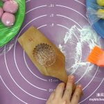 2 把木模具裹上少许糯米粉,把多余的去除。(温馨提示:这食谱用的红龟粿木模是35克的,约 6 cm x 5.5 cm。)
