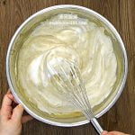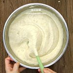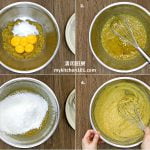 - 把蛋白霜分4次加入面糊中,用人工搅拌器轻轻混合。