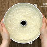 8 把搅拌碗敲击桌面数次以震破大气泡,然后把面糊倒入22-cm中空活底戚风烤模(不要抹油),再把烤模轻轻敲击桌面数次。