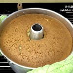 - 把搅拌碗敲击桌面数次以震破大气泡,然后把面糊倒入22-cm中空活底戚风烤模(不要抹油),再把烤模轻轻敲击桌面数次。