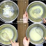 - 把蛋黄加入已冷却的芝士糊,拌至混合。加入刨柠檬皮和柠檬汁拌匀。把面粉过筛加入拌匀 (不要过度搅拌)。