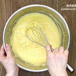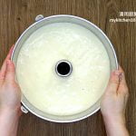 8 把搅拌碗敲击桌面数次以震破大气泡,然后把面糊倒入22-cm中空活底戚风烤模 (不要抹油),再把烤模轻轻敲击桌面数次。