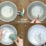 5 以低速把蛋白打至起粗泡。加入塔塔粉,继续打至细泡。慢慢的把细砂糖加入,继续以低速打至干性发泡 (搅拌器拉起蛋白霜会形成直立状)。(温馨提示:蛋白和打蛋白的器具里不能有任何油份和水份,包括蛋黄。建议用洗碗剂把蛋的外壳和器具清洗干净,然后用干净的布抹干。用一个干净的小碗来把蛋黄和蛋白分开,如果蛋黄破裂了,那个蛋白就不要用了。)
