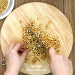 6 把牛油和35克砂糖混合,以中速打至松发。慢慢把蛋黄加入,打至完全混合。把粉类过筛加入,以低速拌至混合。加入核桃粒,拌至混合。