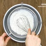 - 把130克低筋面粉,泡打粉和奶粉混合过筛。