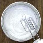 5 以低速把蛋白打至起粗泡。加入塔塔粉,继续打至细泡。慢慢的把砂糖加入,继续以低速打至湿性发泡 (蛋白霜有光泽,搅拌器拉起会形成弯钩状)。(温馨提示:蛋白和打蛋白的器具里不能有任何油份和水份,包括蛋黄。建议用洗碗剂把蛋的外壳和器具清洗干净,然后用干净的布抹干。用一个干净的小碗来把蛋黄和蛋白分开,如果蛋黄破裂了,那个蛋白就不要用了。)