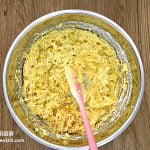 分4次把蛋白霜加入面糊,用刮刀轻轻翻拌至完全混合。