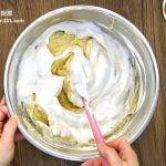 7 分4次把蛋白霜加入面糊,用刮刀轻轻翻拌至完全混合。