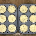 把玛芬蛋糕模 (直径=8 cm,深=3 cm) 铺上杯子蛋糕纸托,平均的把面糊装入每个杯子。