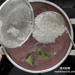 黑糯米和红豆都软化后,加入盐,糖,椰奶和香兰叶。