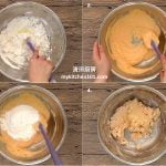 3. 把热水(70°C)加入100克糯米粉搅拌,然后加入橙番薯泥拌匀。把糖粉和另100克糯米粉混合后加入拌成粉团。
