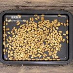 1 把花生仁铺一层在烤盘上,以170°C/340°F烘烤15分钟,直到呈金黄色。 搁置一旁至完全冷却