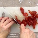3 用中小火把腊肠煎香,然后切成薄片备用。