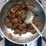 - 加入已腌制好的鸡肉和冬菇,拌炒至香备用。
