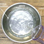 - 把1公升的清水和400毫升的热水(热水炉取出的热水)混合在比搅拌碗大的钢盆以调出约45°C/113°F的温水。