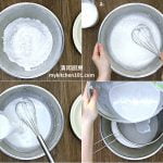 2. 把粘米粉、绿豆淀粉和木薯淀粉混合,加入330克的清水拌匀。加入浓椰浆拌匀。把粉浆过滤入不锈钢锅。(温馨提示:建议用新鲜椰浆,味道比较好。)