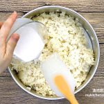 4 把糯米饭放入已铺上烤盘纸的8吋方形烤盘,然后压至紧实。