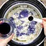 - 把蓝花汁加入一部分的糯米,继续以中火蒸5分钟。