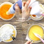3 把盐、糖和蒸橙番薯加入香兰香味水,搅拌至细腻。加入浓椰浆拌匀。加入中筋面粉和玉米淀粉,拌至混合。用滤网把橙薯糊过筛。