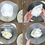 1 把包粉、澄面粉、细砂糖和即溶酵母混合拌匀。慢慢加入清水,拌成面团。如果面团比较干,可以多加一点水,½茶匙½茶匙的加,直到像视频里的湿度 (所有面粉组成面团,面团不黏手)。加入食油, 搓至混合。