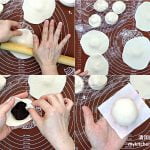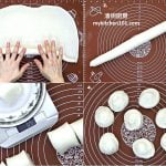 - 把已松弛的面团擀成长方型的薄面团,然后卷起成长条状,分成8份,每份约65克。把面团滚圆 (用保鲜膜盖上避免变干)。