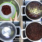 2 稍微冷却后,用搅拌机把煮软的红豆打至细腻 (如果锅里的水份太多可以倒掉一些)。把红豆泥过筛。加入盐、糖、糯米粉水和油,拌至混合。