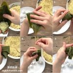 2. 把糯米装入粽叶杯,在中间开一个洞,放入红豆馅,再加入适量的糯米把内馅完全覆盖着。把粽子裹好,然后用竹绳绑好 (先把竹绳过水后滤干,才不会容易断)。