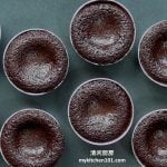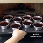 - 把巧克力面糊平均倒入模具,以200°C/390°F烘烤8分钟。(温馨提醒: 如果用容量较大的模具做6个,烘烤时间可增至10分钟。切记不要烤过时,不然就没有岩浆,只剩巧克力蛋糕了。)