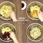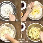 把普通面粉、玉米淀粉和糖粉混合过筛。加入冷牛油,把牛油搓入粉类当中。