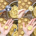 取出1汤匙 (约18克)的面团,压至紧实,轻轻搓圆,然后用掌心轻轻按扁。把饼干面团放在已铺上不沾烤盘纸的烤盘上。(温馨提示:把饼干分成2-3批,一次烘烤一批。)