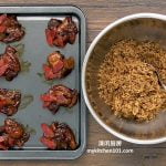 - 糯米:热锅,加入食油,放入蒜头和姜片以中小火爆香后,加入糯米拌炒。把所有调味料加入清水拌匀,加入糯米后炒香。