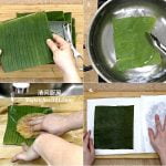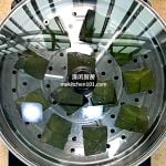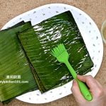1 准备12片(6 吋 x 7 吋) 长方形香蕉叶。放入热滚水里汆烫至软。用洗碗网轻轻清洗干净,然后用厨房纸巾抹干。