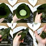 4 把香蕉叶折成圆锥形,放入已包入馅的粉团,轻轻按下,用香蕉叶包上后塞入底部。