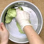 3 把糖粉和另100克糯米粉混合后加入拌成粉团。依粉团的湿度加入适量的香兰汁(约1/2茶匙),搓成光滑的粉团。