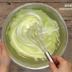 6. 把蛋白霜分3次加入面糊中,用人工搅拌器轻轻混合。