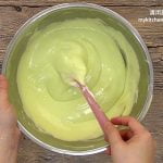 7. 再用刮刀轻轻翻拌至完全混合,把搅拌碗敲击桌面数次 (以震出大气泡)。