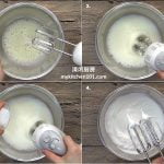 蛋白霜:以低速把蛋白打至起粗泡。加入塔塔粉,继续打至细泡。慢慢的把砂糖加入,继续打至干性发泡 (搅拌器拉起蛋白霜会形成直立状)。